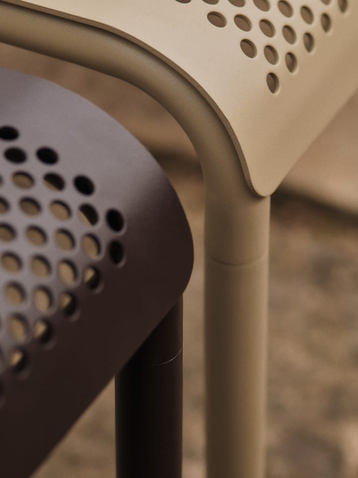 Nadaje się do użytku na zewnątrz. Galwanizacja elektrolityczna sprawia, że stal jest odporna na rdzę. Perforacja zapobiega gromadzeniu się wody deszczowej. Pakowane na płasko. Zarejestrowany wzór. Ten produkt jest zgodny z europejskimi normami bezpieczeństwa produktów: EN 581 1-2 Meble ogrodowe, do użytku domowego i kontraktowego. Normy dotyczą wagi do 100 kg - KOLOR: kaszmirowy, zielona herbata, czekoladowy